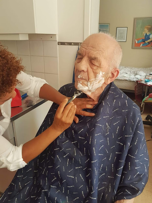 “Indira har tagit hand om mig sedan tiden då hon arbetade på hemtjänsten och jag ser mycket fram mot hennes besök då hon både klipper och rakar mig. Det gör hon mycket bra.”